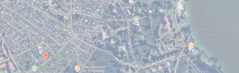 Der Kleingärtnerverein „Pfingstberg e.V.“ liegt im Norden Potsdams im Stadtteil „Nauener Vorstadt“. Wir befinden uns unmittelbar am nördlichen Fuß des Pfingstberges, auf dem die Belvedere und der Pomonatempel stehen. Den BUGA- bzw. Volkspark Potsdam und die Biosphäre kann man in ungefähr ½ Kilometer westlich von uns erreichen. In ca. 500 Meter süd-östlicher Richtung befinden sich der Jungfernsee, die Meierei sowie das Schloß Cecilienhof mit dem Neuen Garten und dem Heiligen See.